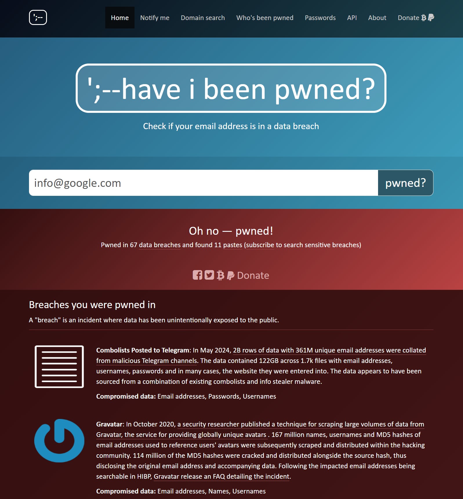 このサービスは、メールアドレスとともにパスワードが流出したか否かにフォーカスしているので、もし流出ありと判定された場合は対応が必要。